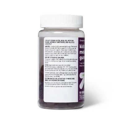 Help your child sleep easily and stay asleep longer with these Kids’ Melatonin Gummies from up & upâ„¢. This kids’ dietary supplement includes 90 melatonin gummies to help your child with sleep issues. Free of gluten, milk, egg, artificial sweeteners or flavors, these sleeping aid gummies for kids contain melatonin to provide short-term support for healthy sleep. Suitable for kids above four years, these gummies feature a yummy natural blackberry, raspberry and plum flavor that’s sure to make chewing fun.